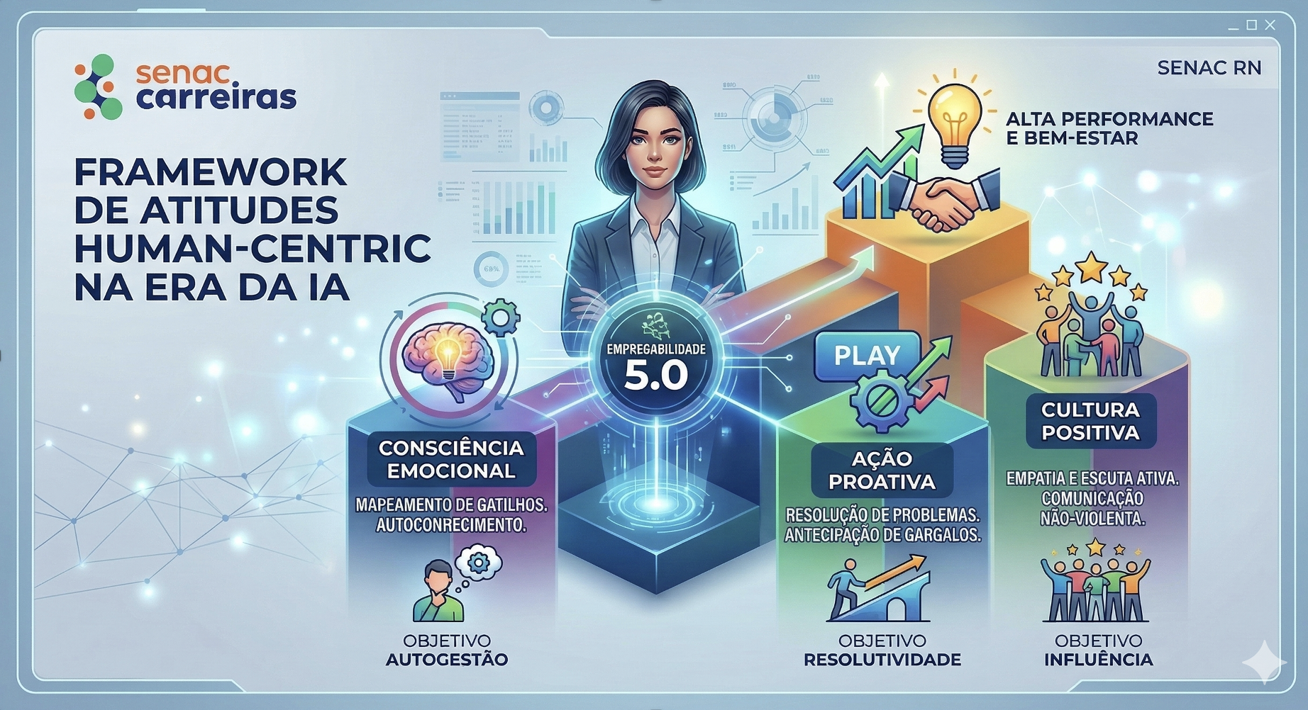 Esse framework pode ser desdobrado em atividades práticas em sala de aula, planos de desenvolvimento em estágios, trilhas de aprendizagem corporativas e orientações de carreira individualizadas, alinhando a proposta pedagógica do Senac à agenda global de futuro do trabalho.